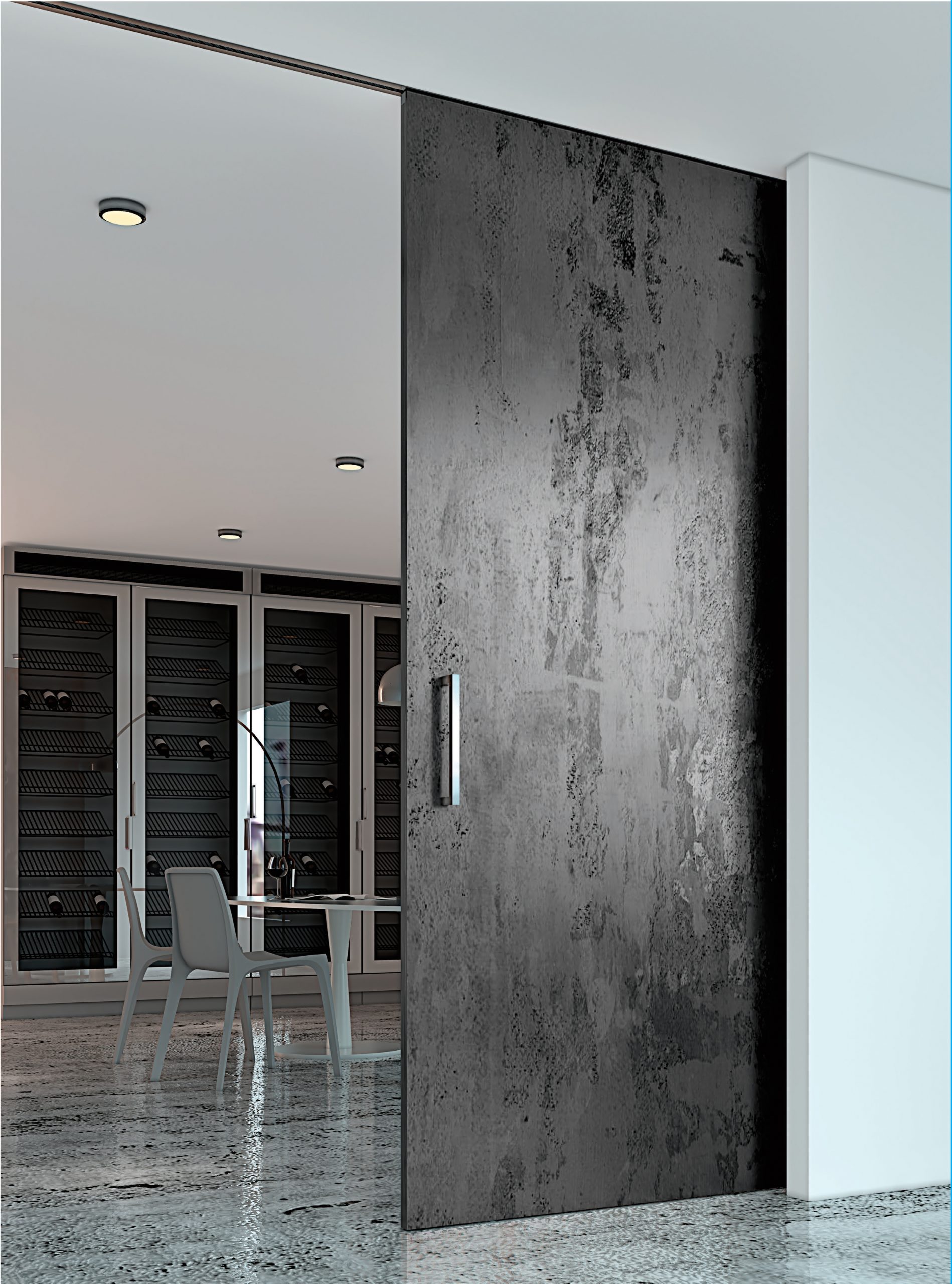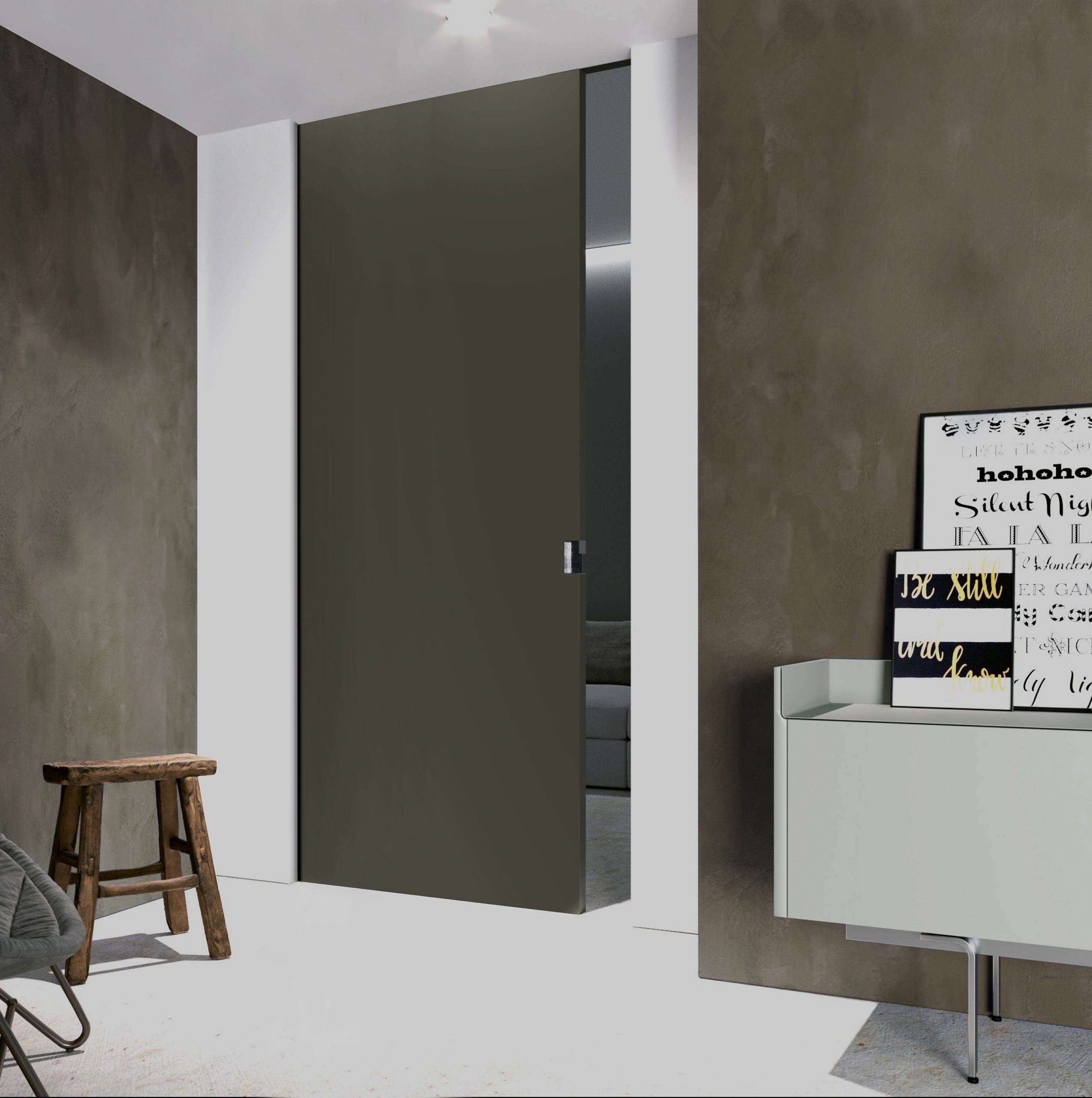 Puerta corredera con armazón de sistema oculto. Este sistema permite la total integración de la puerta corredera en la pared, proporciona un estilo y elegancia únicos en el mercado. Montaje tanto en muro o revoque como en cartón-yeso o pladur.