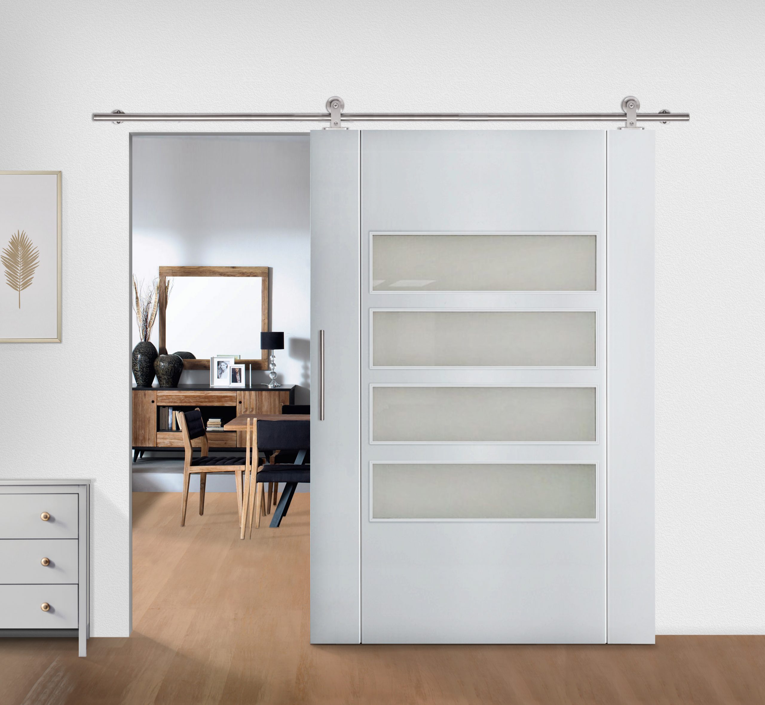 Sistema de diseño moderno para las puertas correderas con guía visto realizado en acero INOX, este sistema permite instalar puertas correderas sin necesidad de realizar obra.