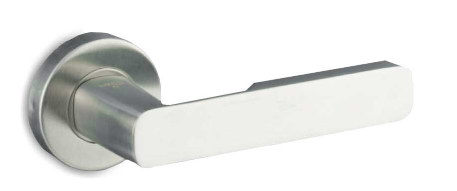 Juego roseta Malta fabricada en INOX 304, compuesta por placa de 8mm de espesor y tirador de líneas rectas.